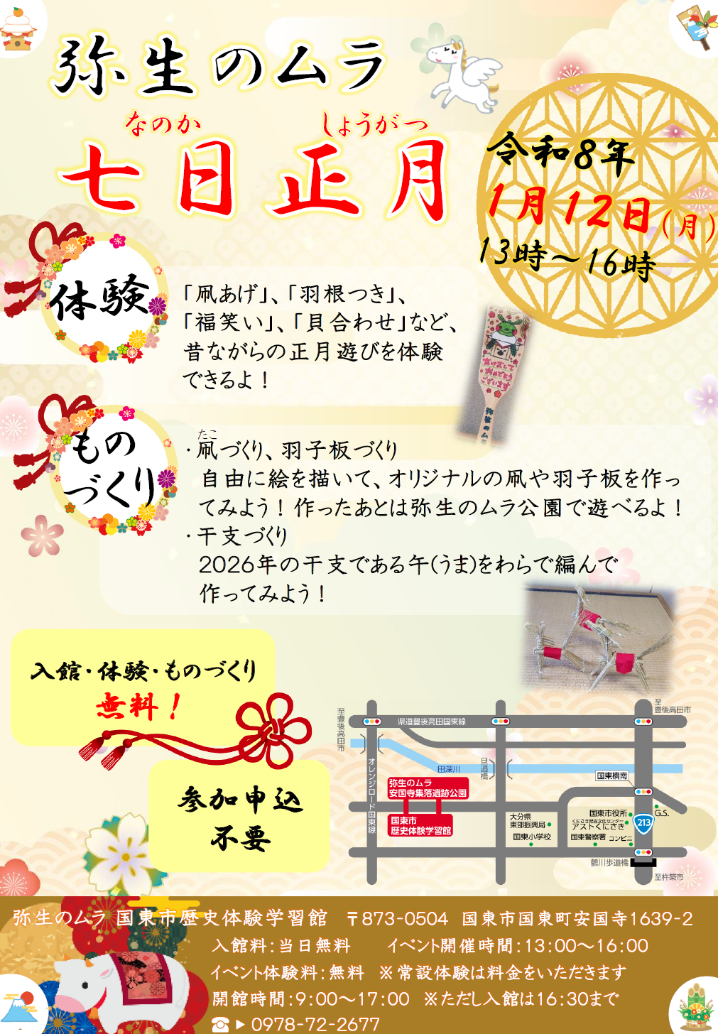 令和8年1月12日(月曜日・祝日) 受付:13時00分から16時00分 入館・体験・ものづくり無料! ※常設体験(火おこし体験、勾玉づくり体験、鋳造体験)は有料です。 ※詳しくはチラシをご覧ください。